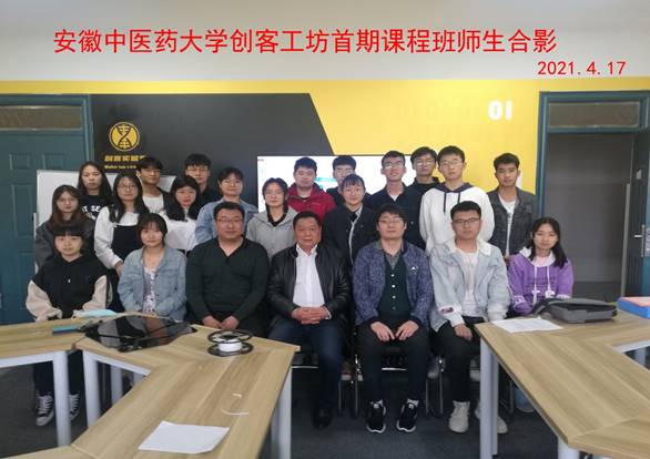 4月17日下午3时,安徽中医药大学创客工坊课程班结业仪式在至精楼205举行,创新创业学院院长孟庆全,项目实践科科长、课程班班主任沈明瑞,课程班24名学生参加仪式。